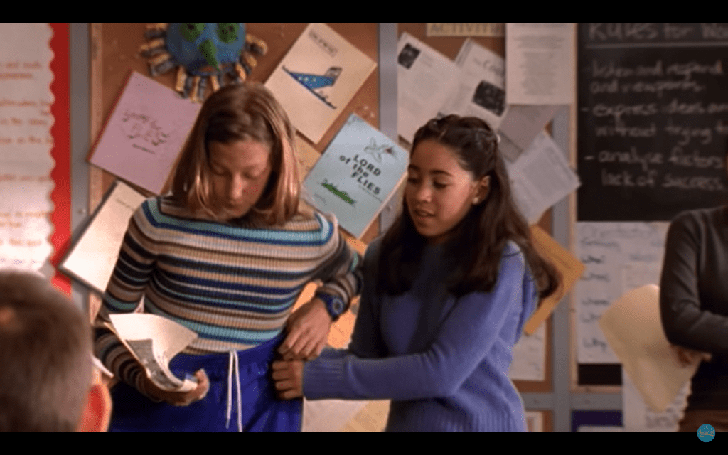 In this episode, Emma starts experiencing mood swings and doesn’t understand what’s happening to her. At one moment, she finds herself sitting on a bench. She gets up to go to class and Manny yanks her back down. Emma has started her period for the first time and it’s stained her white skirt. They walk awkwardly to the restroom, Manny trailing behind her, holding a magazine against the back of her skirt.
